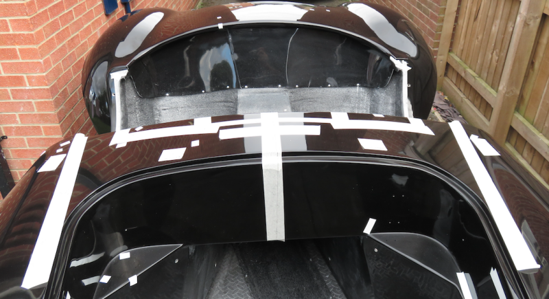 1st Reference Point: For this, I used a wooden spacer taped in position, having first put some insulating tape on the car and screen to protect the gelcoat and chrome. With this wooden spacer securely in place, the screen was now well-supported, and I had my first reference point sorted. I did, at this point, step back to see how the screen looked without me holding it... Awesome!
